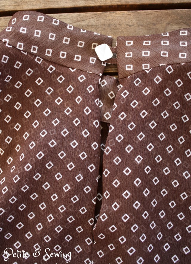 For the collar I used Pro-Silk Organza from Fashion Sewing Supply for the interfacing of the collar (both upper and under) and added a self fabric rouleau for the button closure at the back.